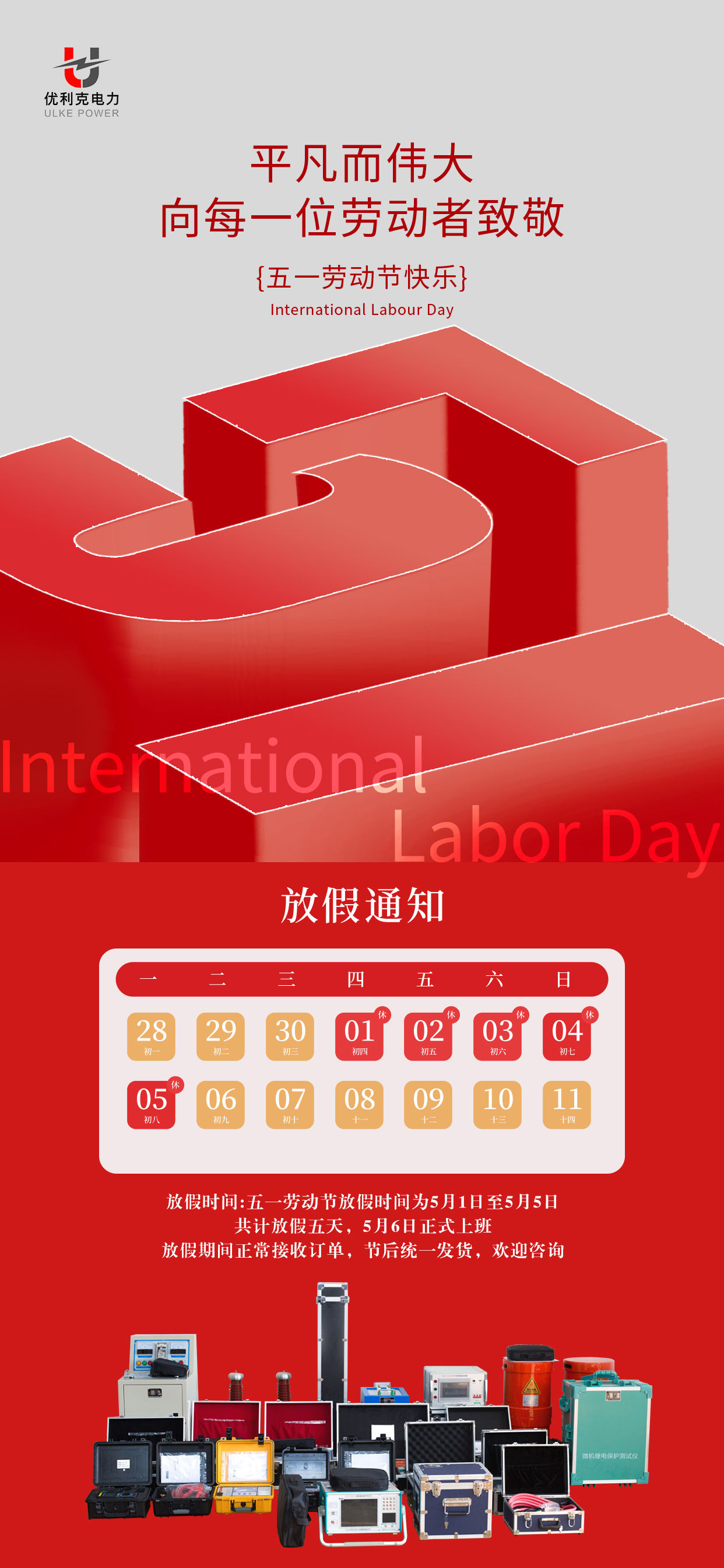 在此,武漢優利克電力設備有限公司全體同仁預祝大家五一勞動節快樂,身體健康,闔家幸福!?